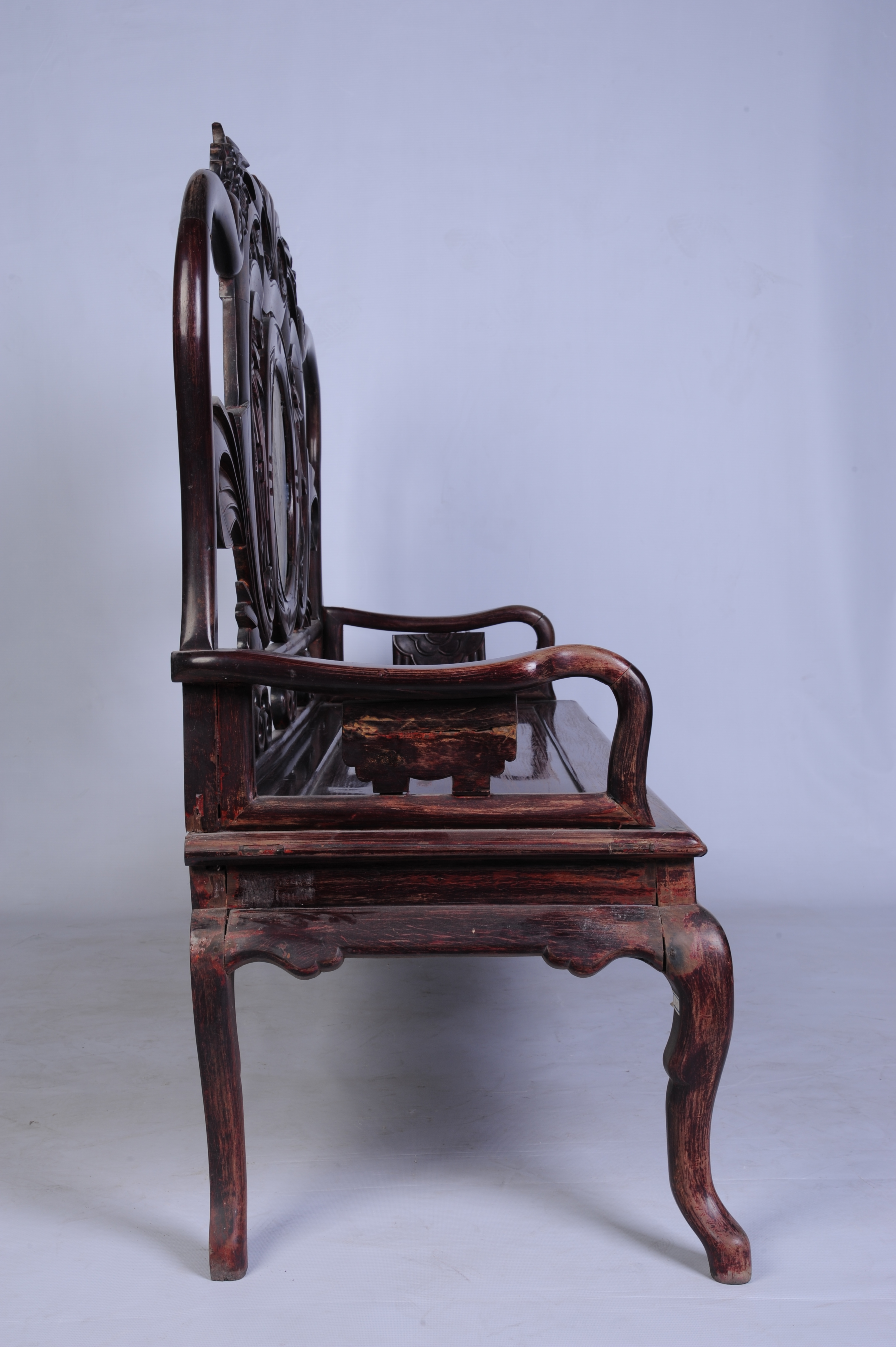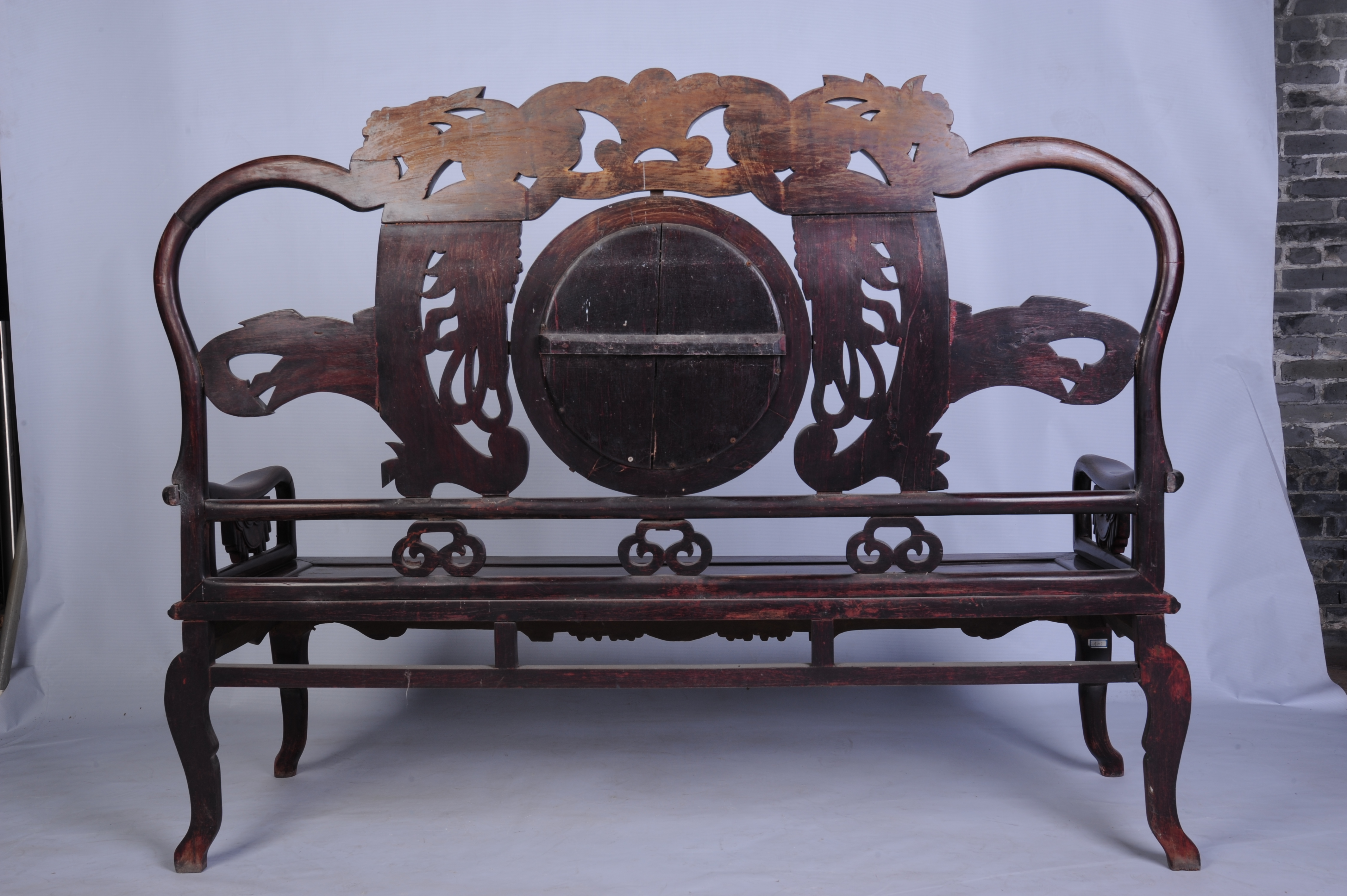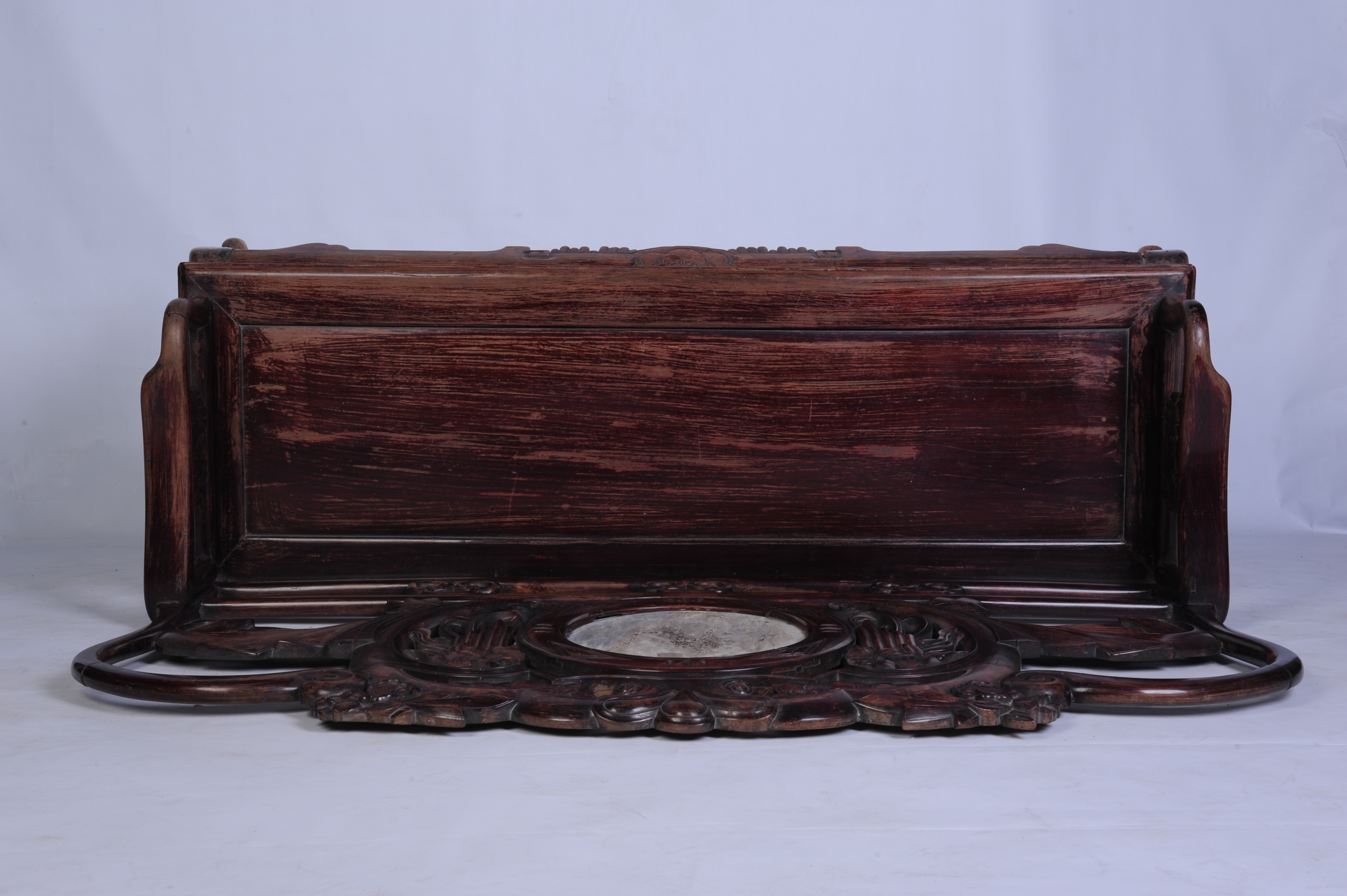 中华民国酸枝镶石靠背长椅 中华民国,通长:160厘米,通宽:54厘米,通高:128厘米。