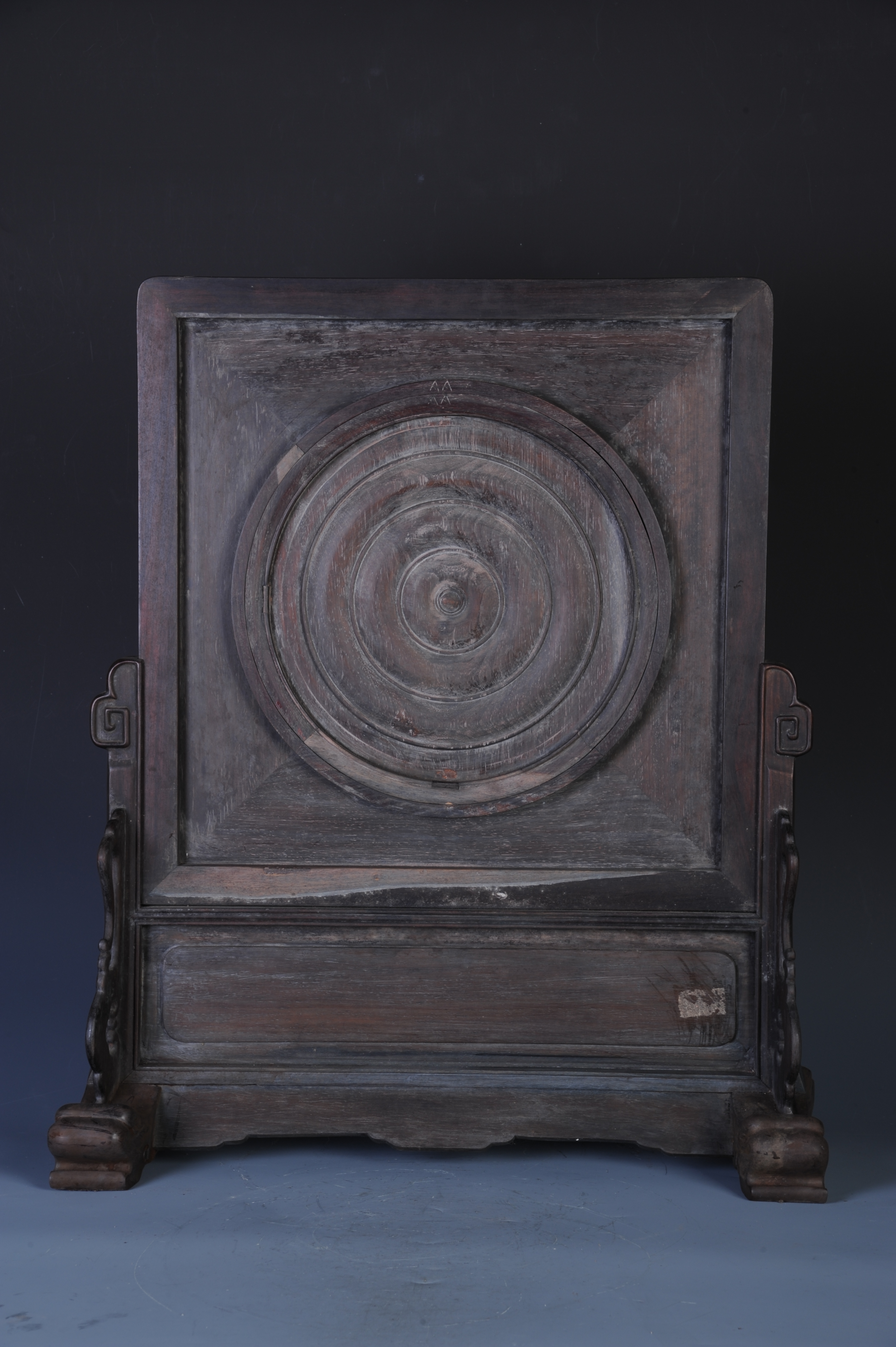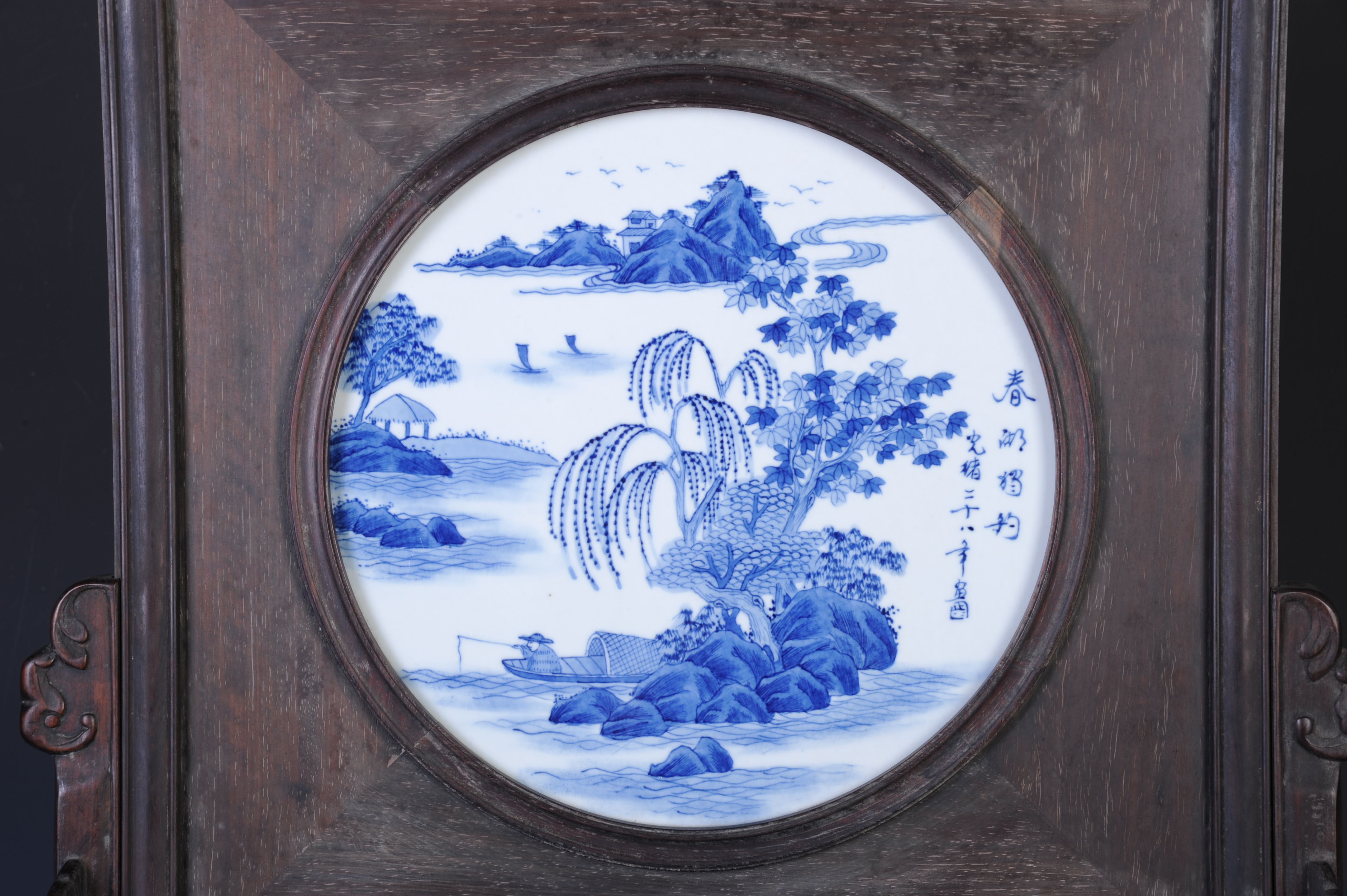 清光绪二十八年酸枝雕博古纹镶瓷板插屏 清光绪二十八年,通长:51厘米,通宽:20厘米,通高:60厘米。