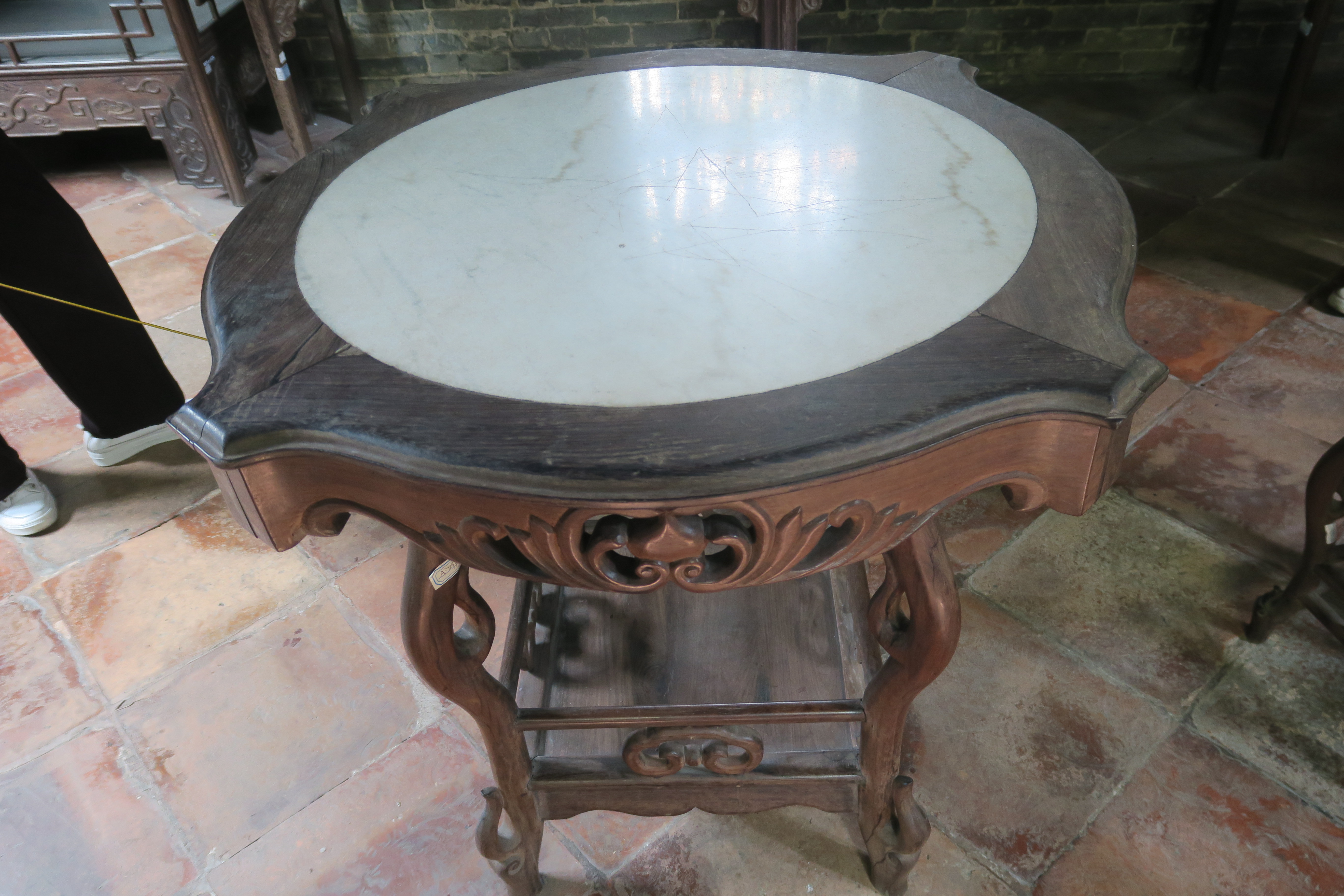 当代红木镶云石圆台 当代,通宽:92厘米,通高:80厘米, 台面圆面直径82厘米,腿高51厘米