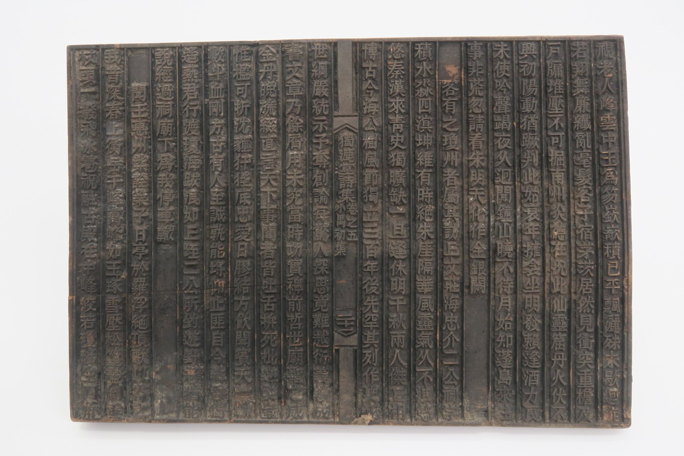 木刻印刷版《独漉堂诗集·卷之五·小禺初集》第二十一、二十二页 质地:木; 尺寸:通长26.1厘米,通宽1.8厘米,通高18.1厘米。