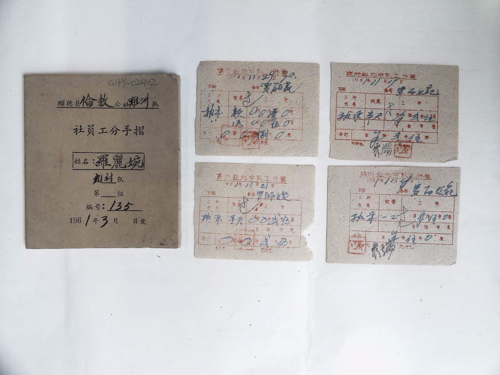 1961年顺德县伦教公社鸡洲队《社员工分手摺》 年代:1961年 质地:纸;尺寸:10.7×9.5厘米。
