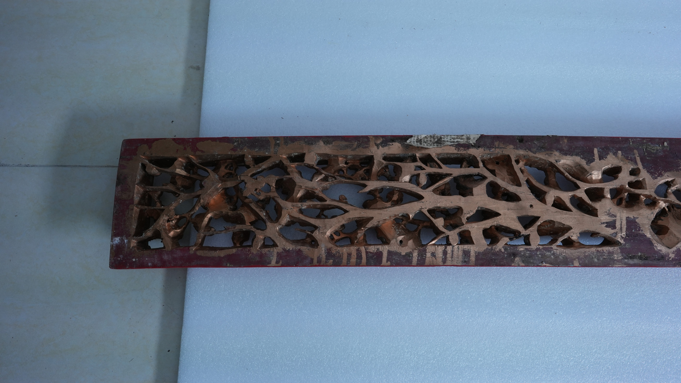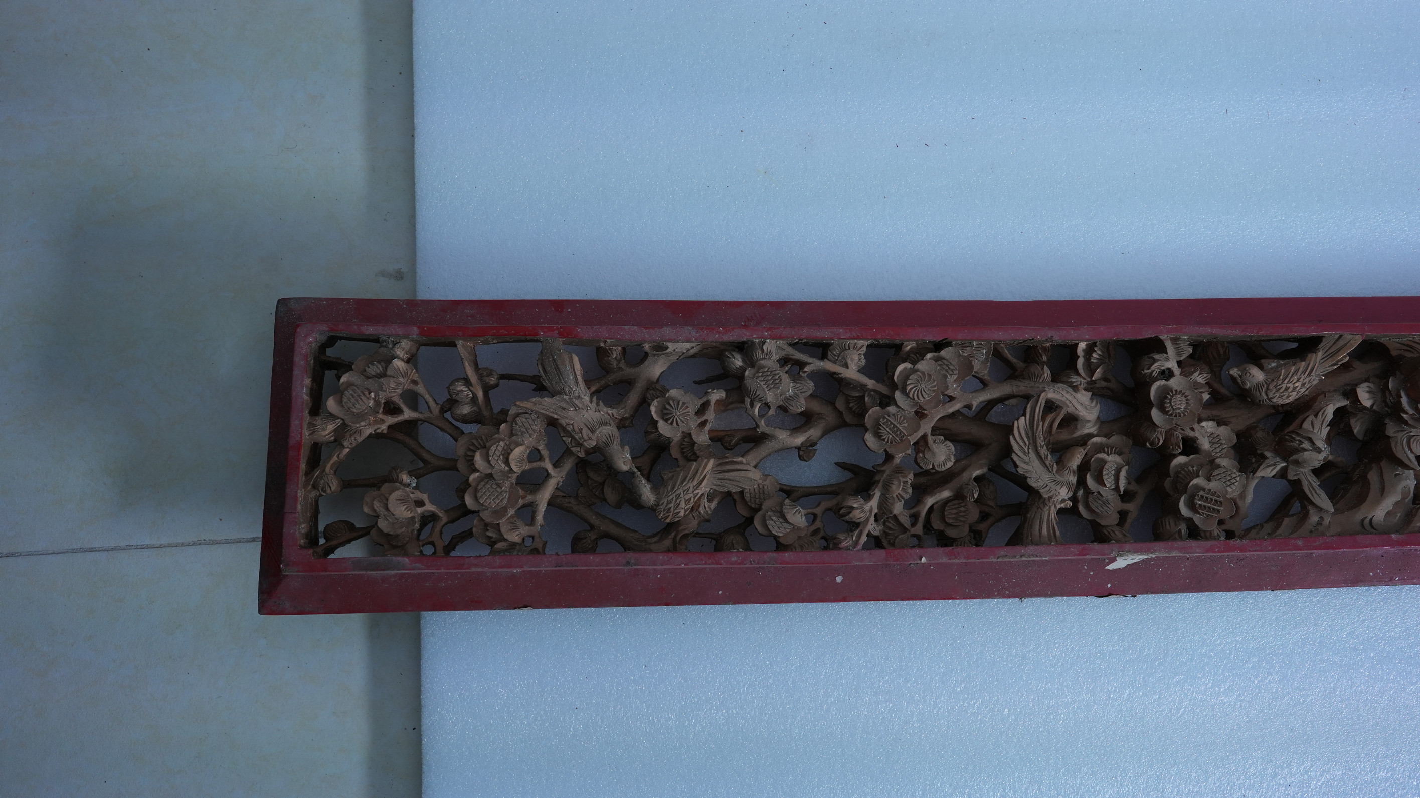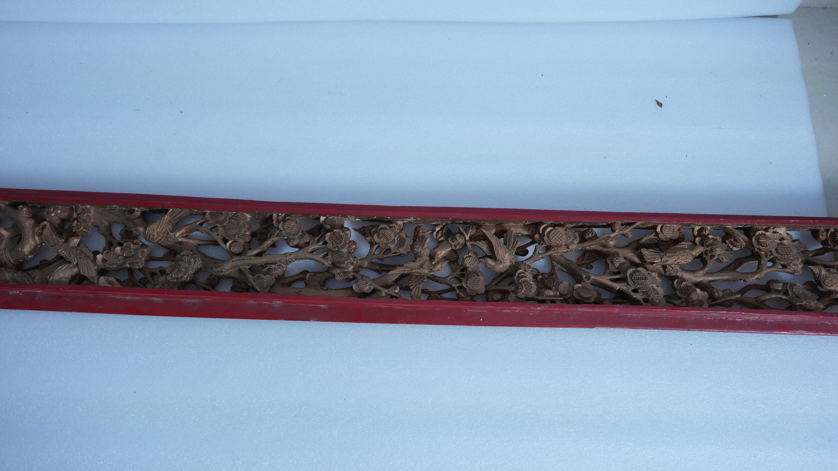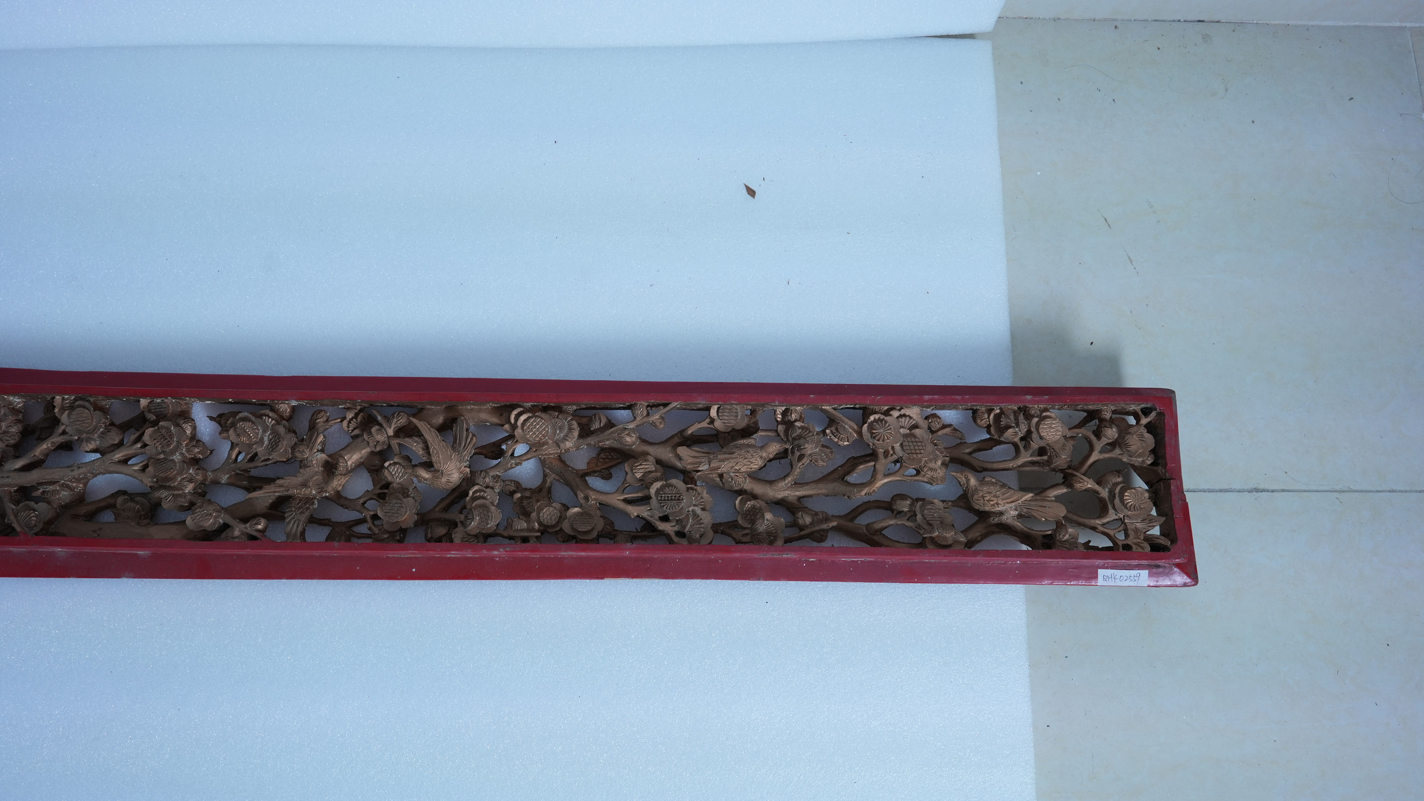 名称:当代金漆木雕花鸟纹条楣 年代:当代 质地:木 尺寸:长229.8cm,宽18.1cm,高5cm