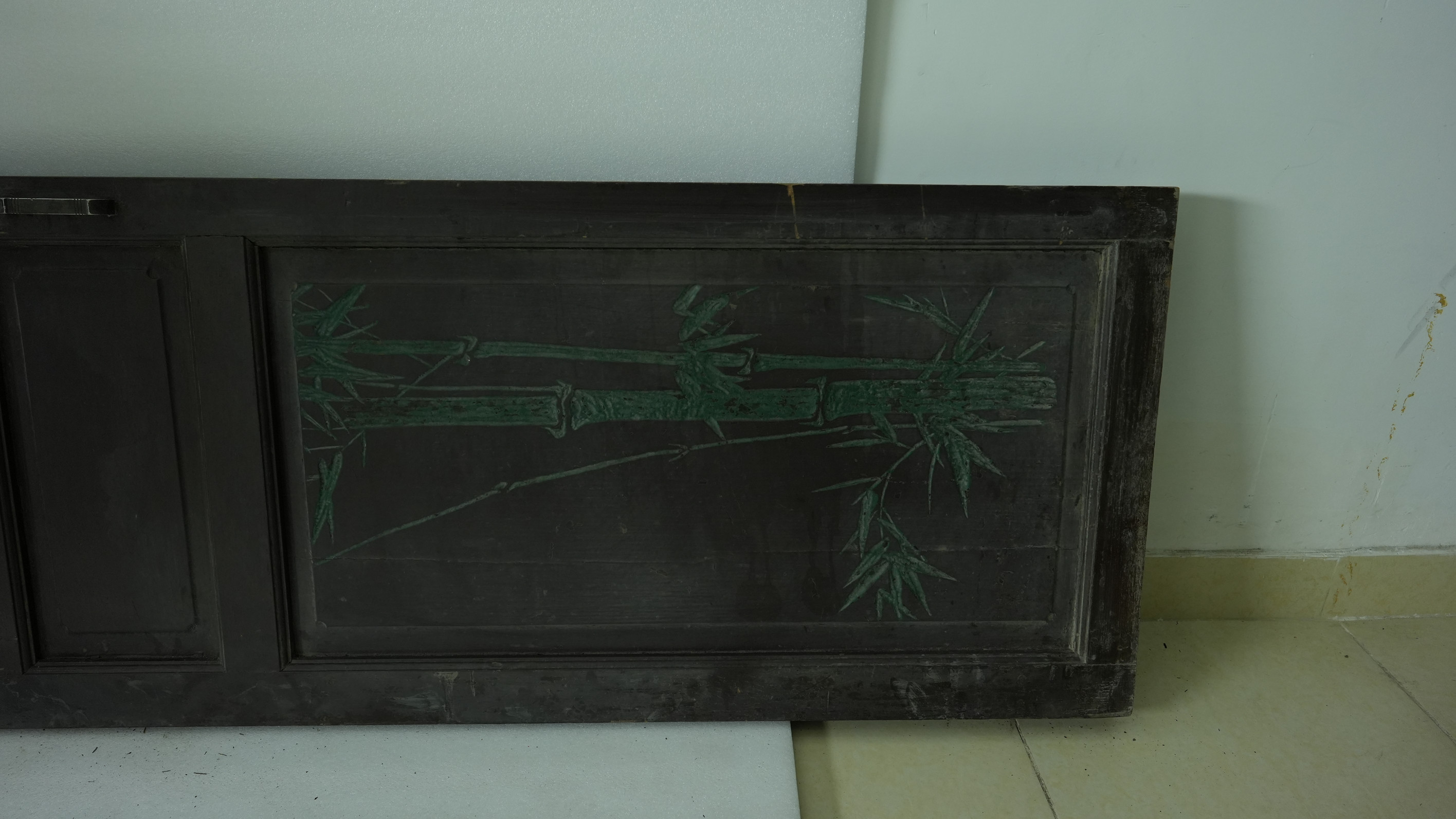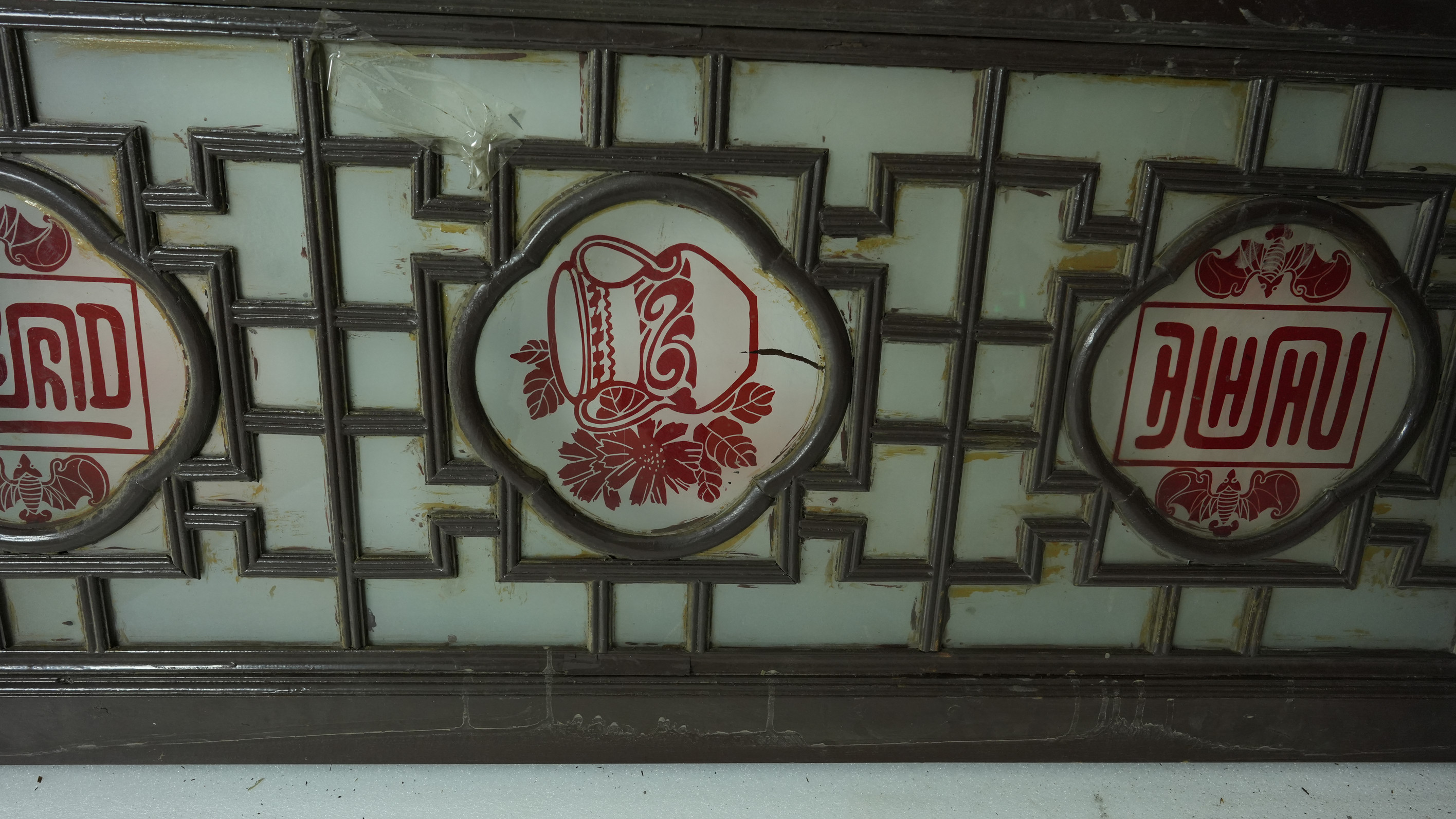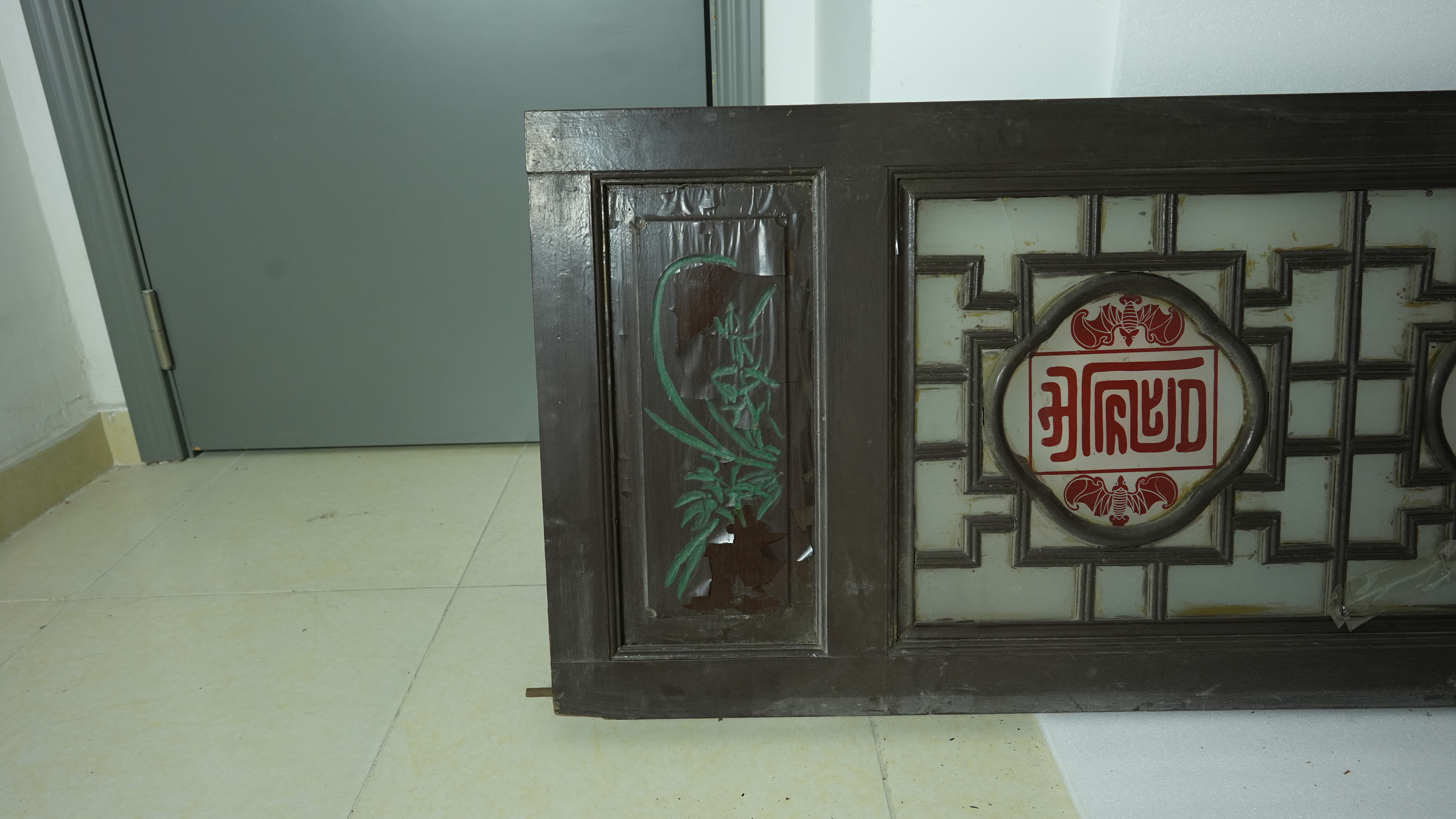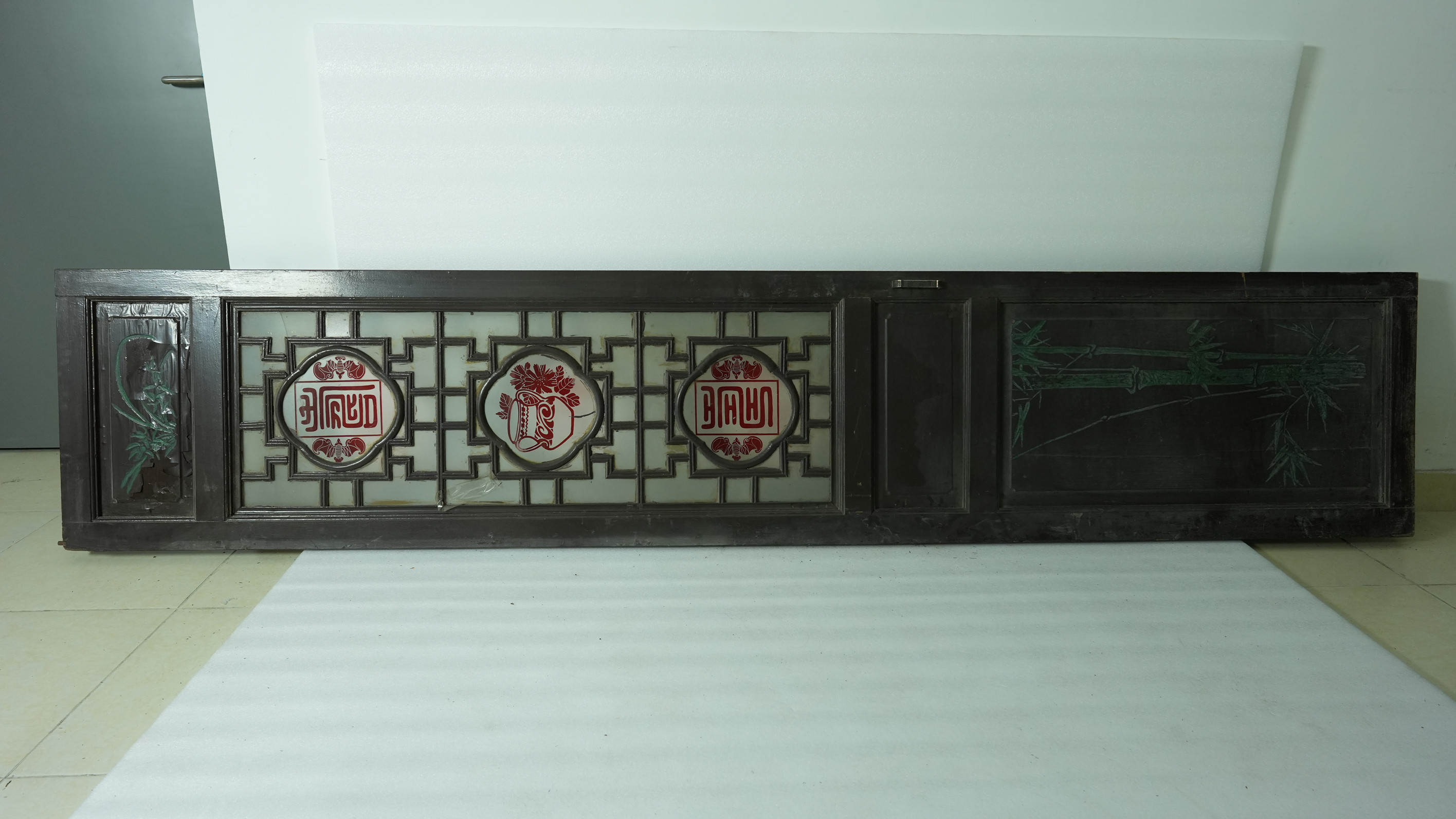 名称:当代满洲玻璃门 年代:当代 质地:木、玻璃 尺寸:长296.4cm,宽59.5cm,厚4.6cm
