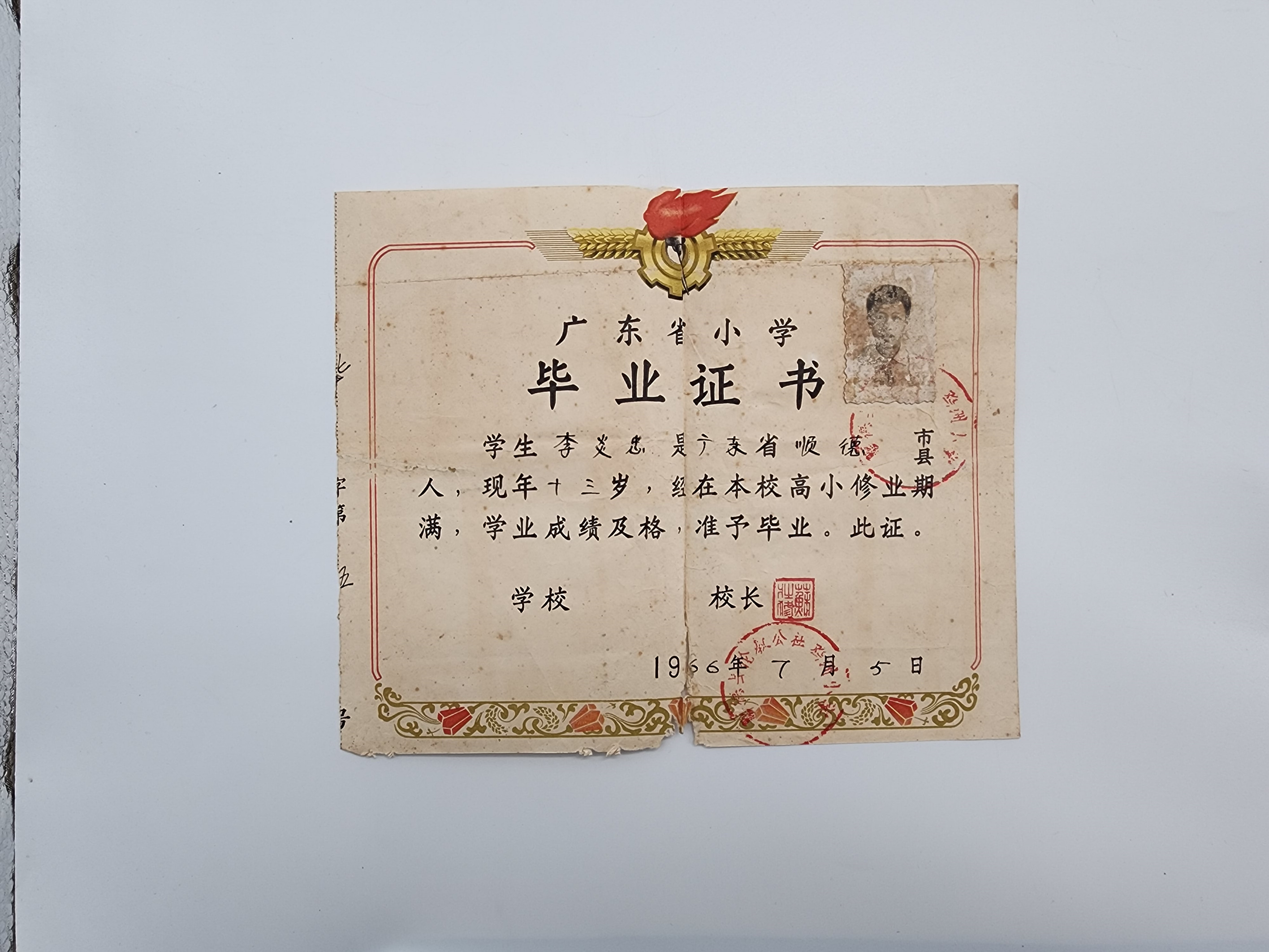 1966年李炎忠先生小学毕业证书
