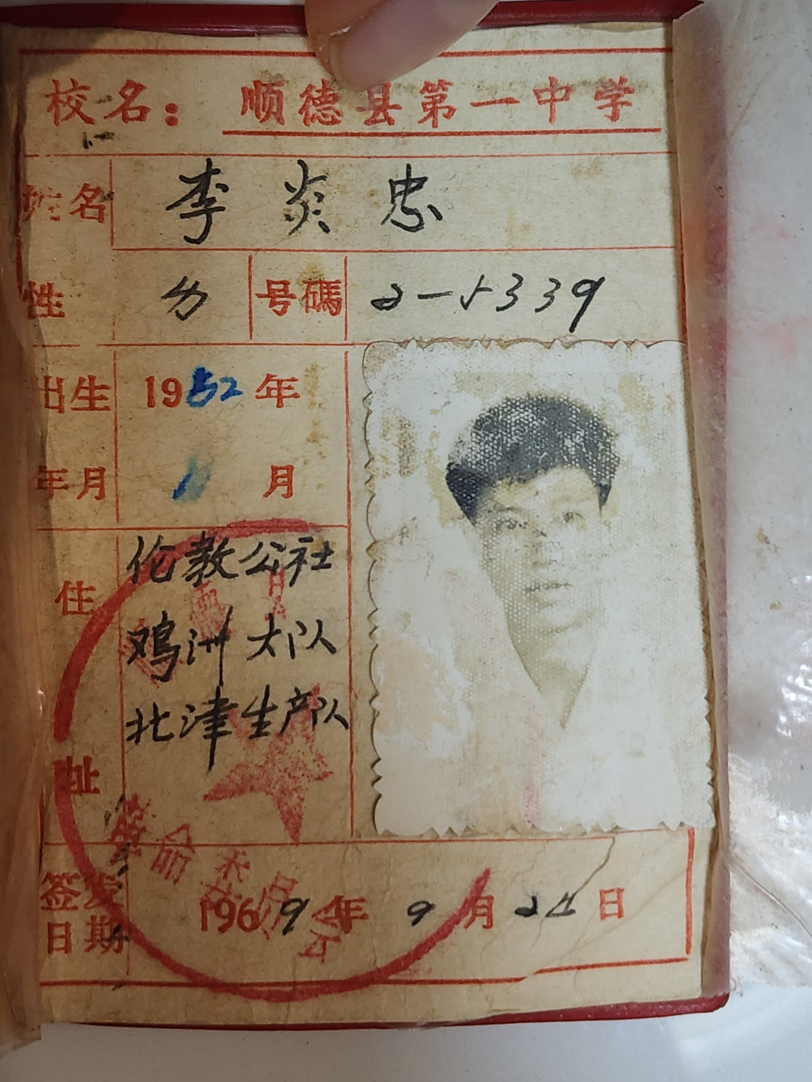 名称:1969年李炎忠先生顺德县第一中学学生证 年代:1969年 质地:纸 尺寸:6.1cm×8.4cm