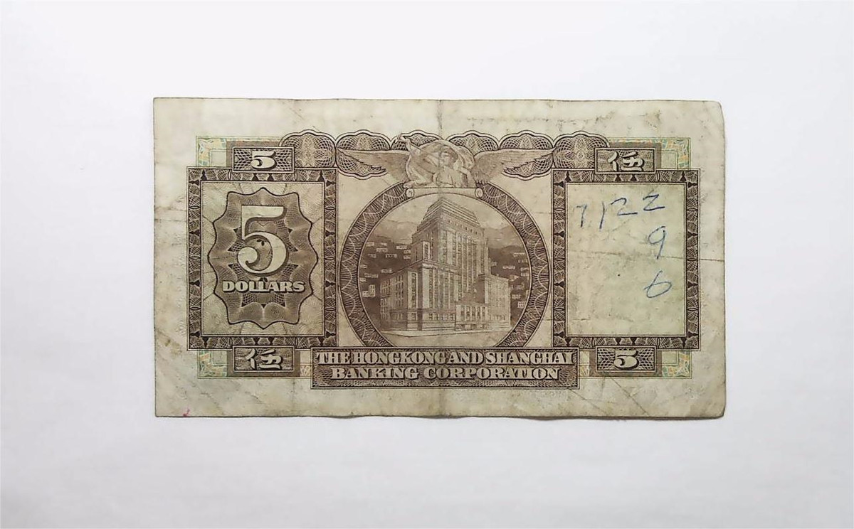 名称:1972年香港上海汇丰银行印发伍圆纸币 年代:1972年 质地:纸 尺寸:14cm×7.8cm