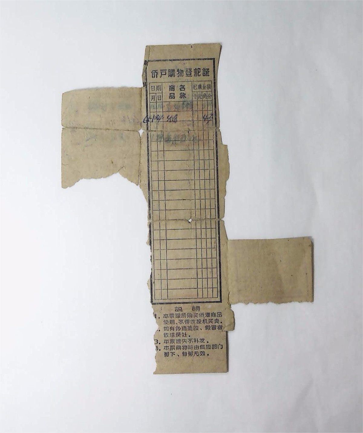 名称:1964年广东省华侨特种商品供应证侨汇人民币弍拾圆(残票) 年代:1964年 质地:纸 尺寸:通长17cm,通宽12.6cm