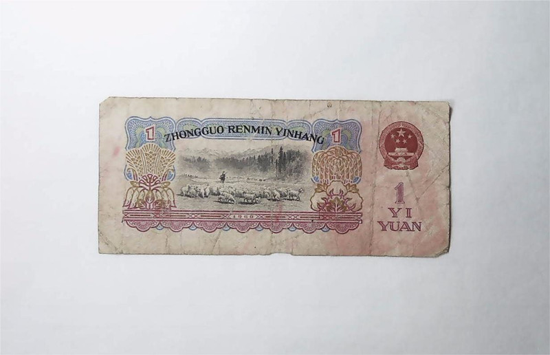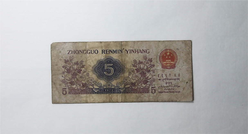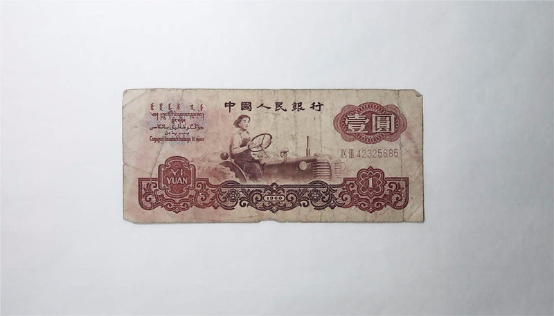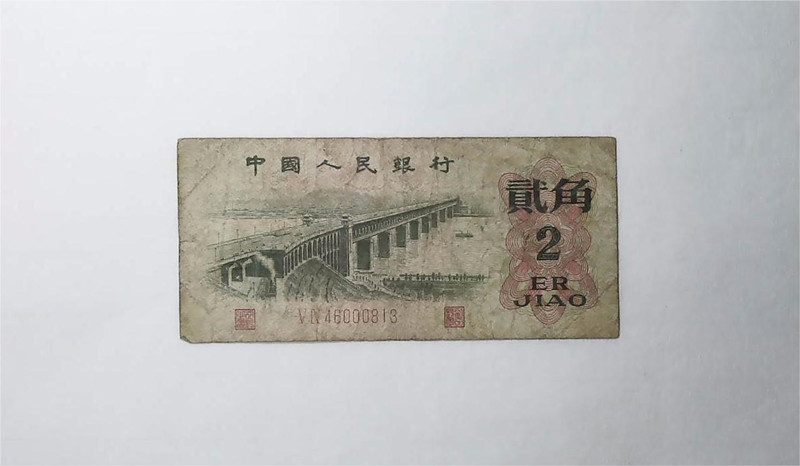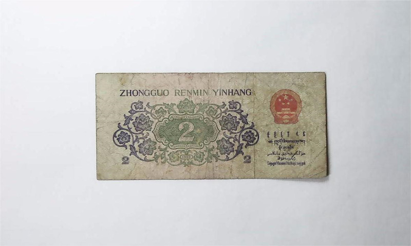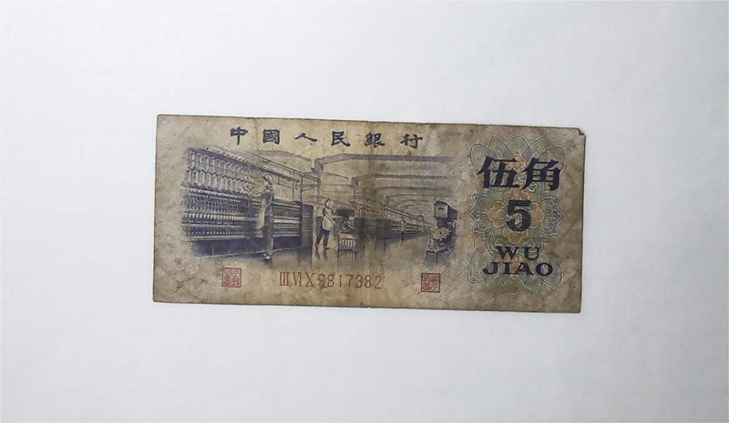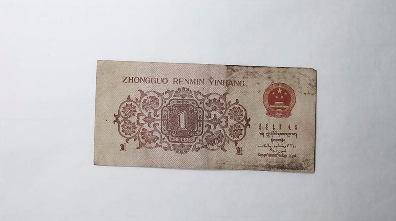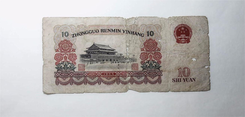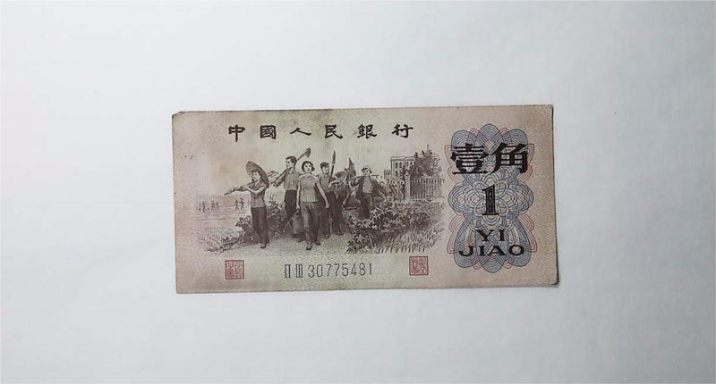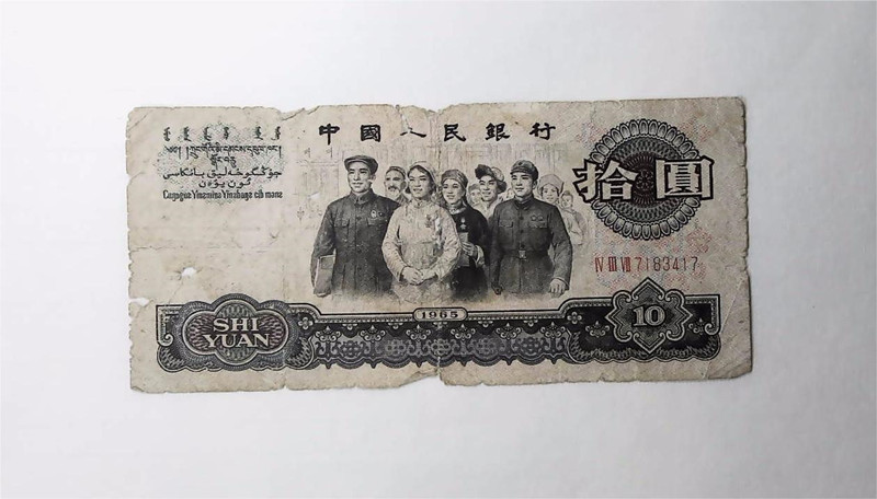 名称:第三套人民币一角等 年代:1960-1972年 质地:纸 尺寸:①1965拾圆 15.3cm×7.1 cm ②1960伍圆 14.2cm×6.6 cm ③1960壹圆 12.8cm×5.7 cm ④1972伍角 11.3cm×4.9 cm ⑤1962貮角 10.7cm×5cm ⑥1962壹角 10.5cm×5cm
