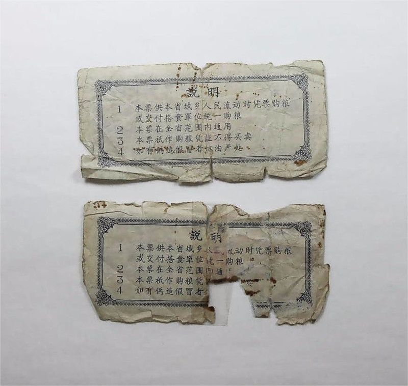 名称:1963年广东省通用粮票拾市斤 年代:1963年 质地:纸 尺寸:①8.6cm×4.2cm ②8.6cm×4.2cm