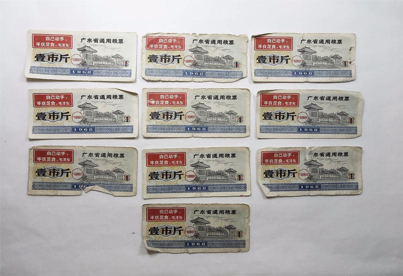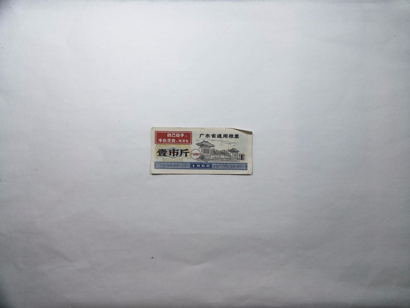 名称:1968年广东省通用粮票壹市斤 年代:1968年 质地:纸 尺寸:7.6cm×3.5cm