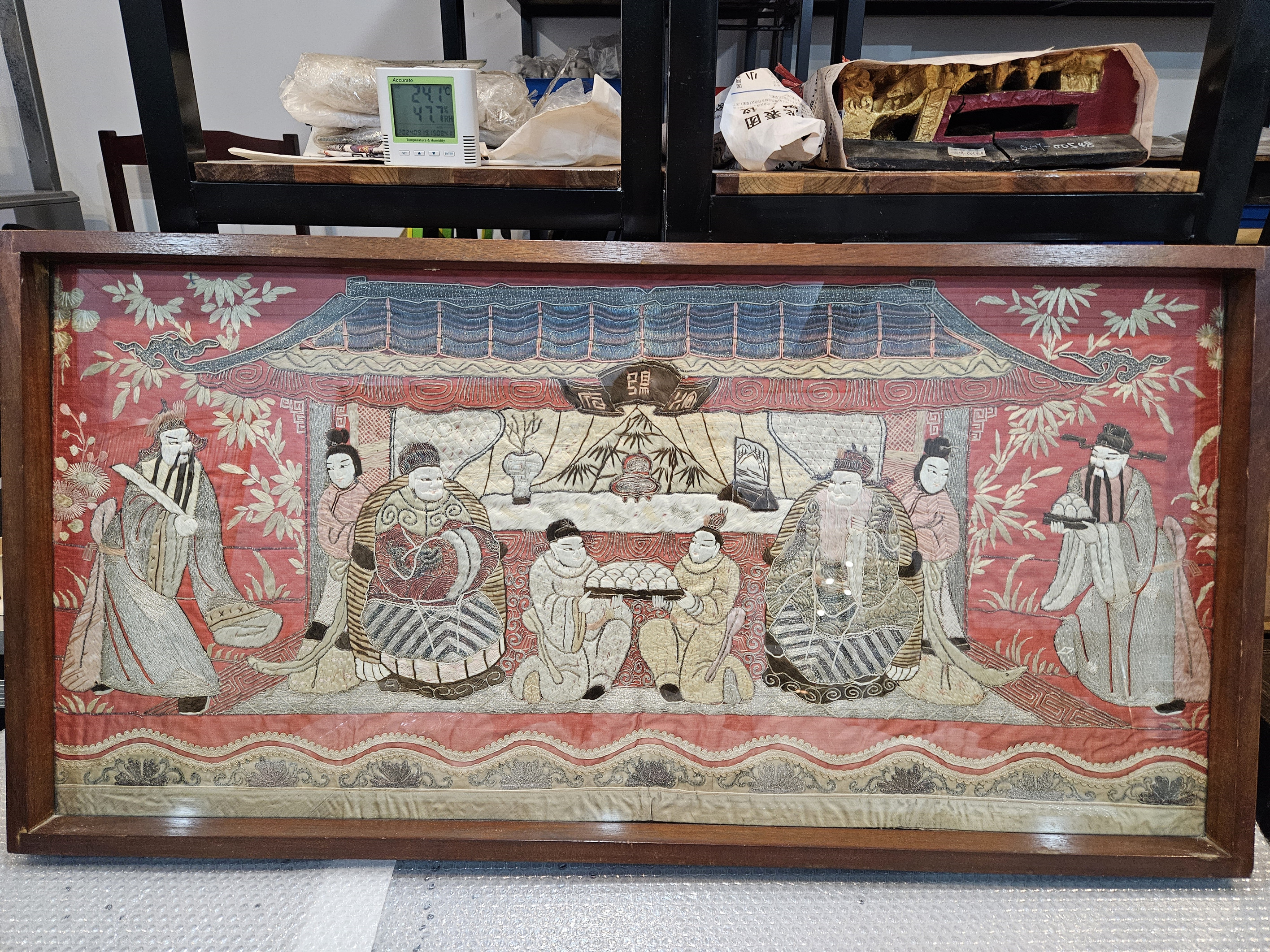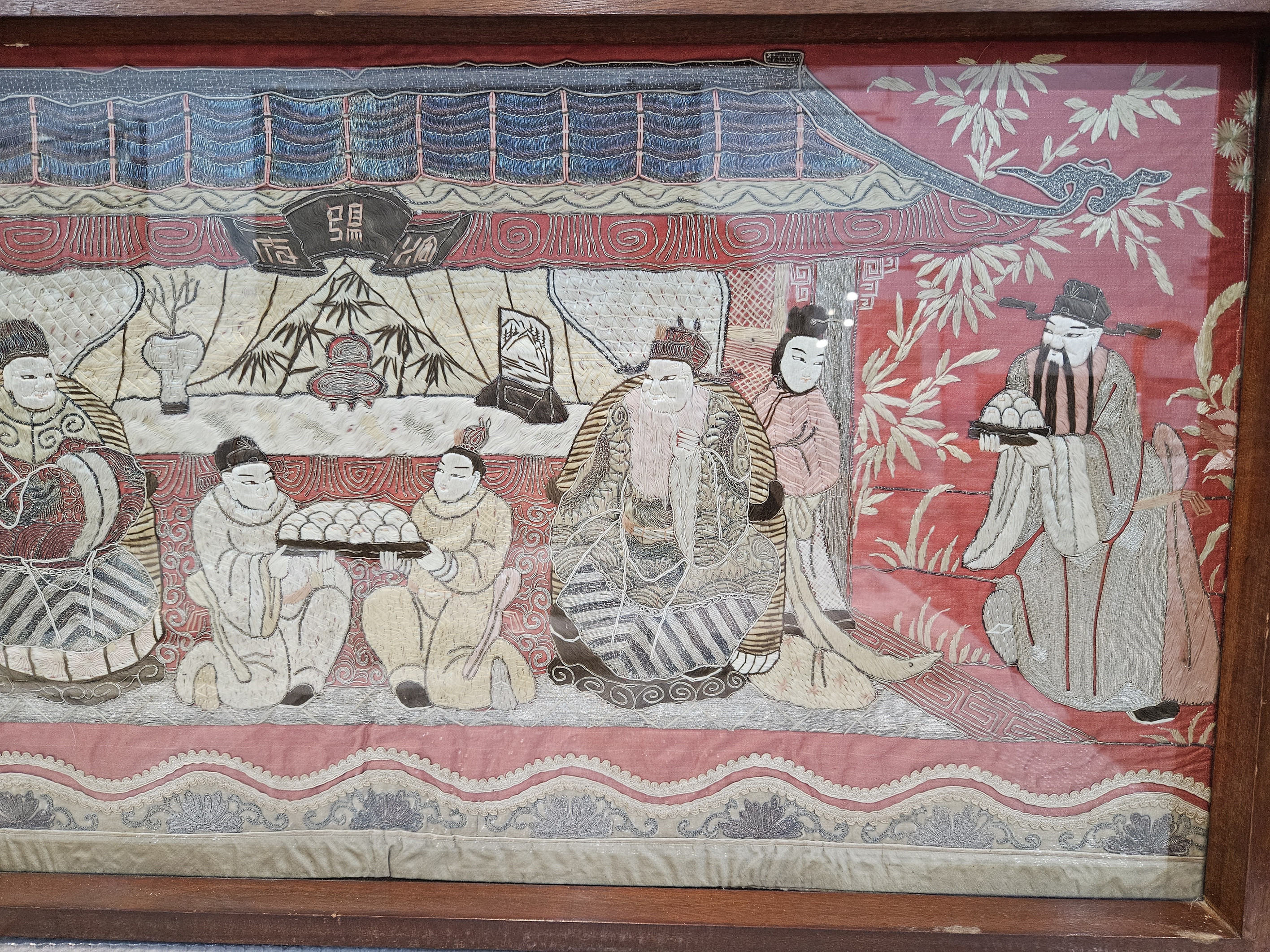 名称:中华民国红缎地盘银绣祝寿图绣件 年代:中华民国 质地:丝、布 尺寸:107×54(连框)