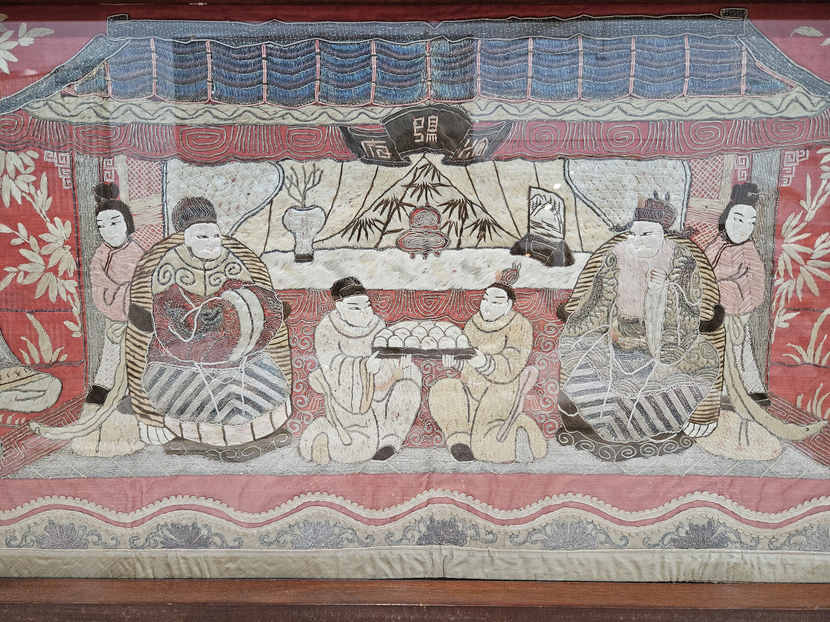 中华民国红缎地盘银绣祝寿图绣件